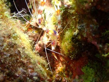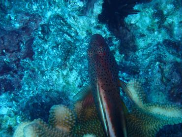 The whip coral goby has a semi-transparent head and body, with white scales running along its vertebra. Its head is reddish-brown to violet in color and the goby has pink to violet-red eyes.[2] Their coloration is noted to match the color of the coral they inhabit.[3] The fish is approximately 3 to 3.5 centimeters long.[4][5] Healthy whip coral gobies have seven dorsal spines, seven dorsal soft rays, one anal spine and seven anal soft rays. They also have cup-like pelvic fins and gills that open below the base of the pectoral fins.[6]